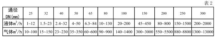 2、液體、工況氣體流量范圍(見(jiàn)表2)