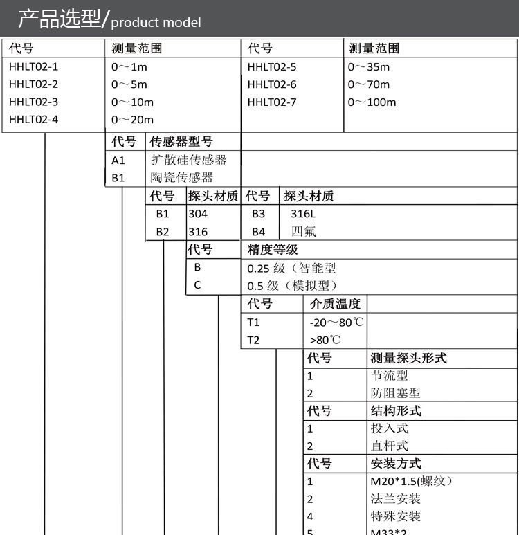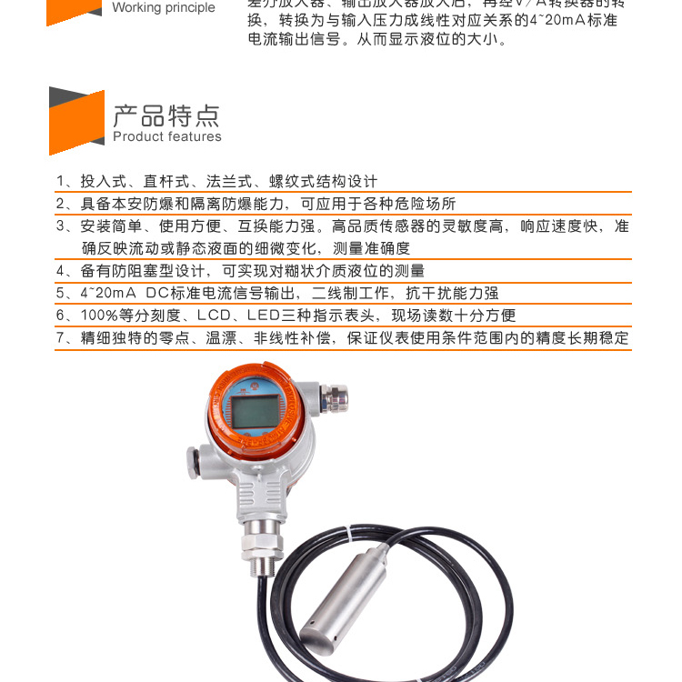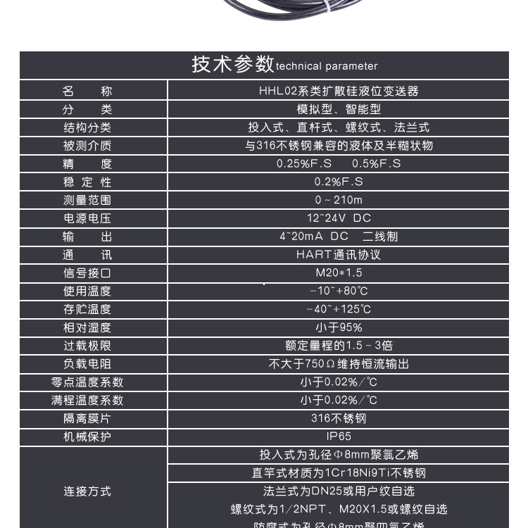 HHLT02智能擴(kuò)散硅液位變送器有投入式、直桿式、法蘭式、螺紋式結(jié)構(gòu)設(shè)計(jì);安裝簡單、使用方便、互換能力強(qiáng)。高品質(zhì)傳感器的靈敏度高,響應(yīng)速度快,****反映流動(dòng)或靜態(tài)液面的細(xì)微變化,測(cè)量****度。