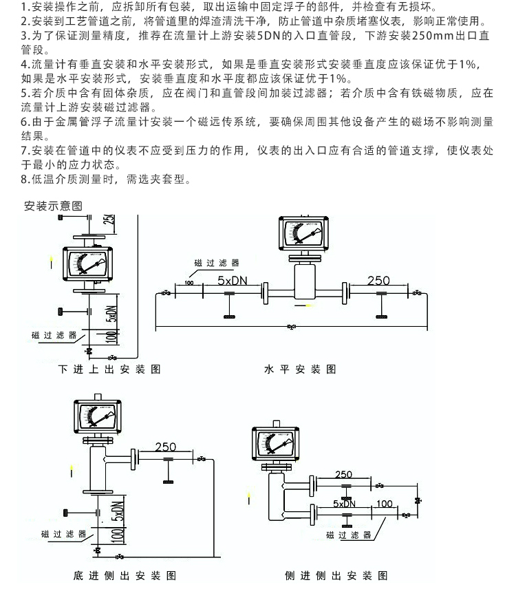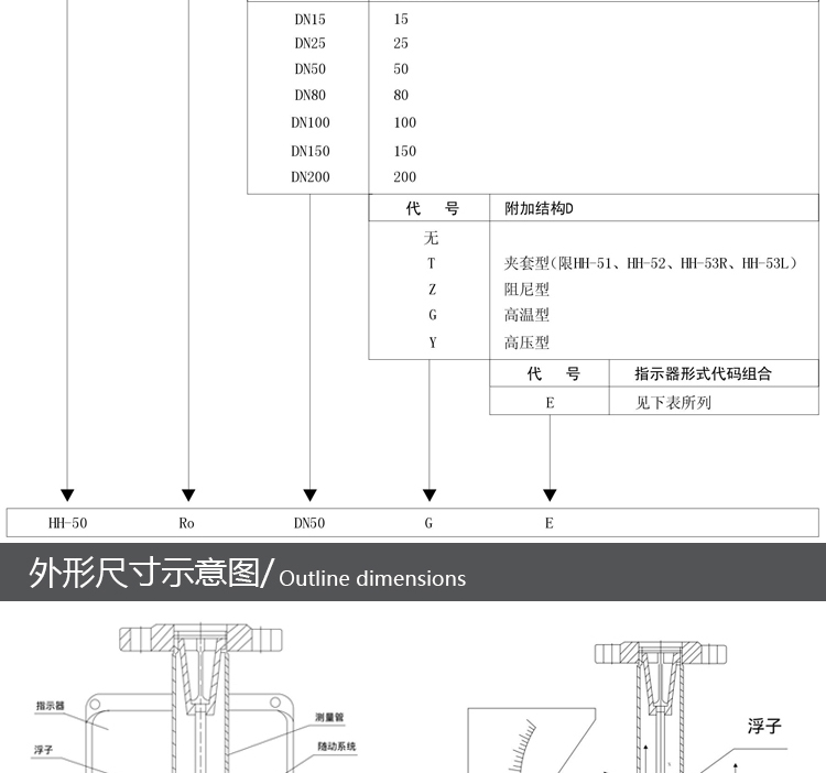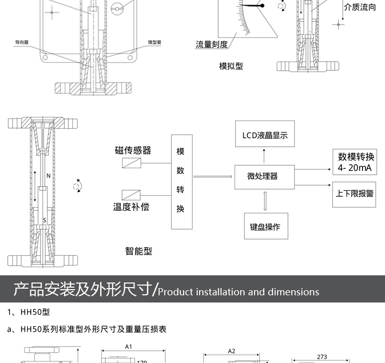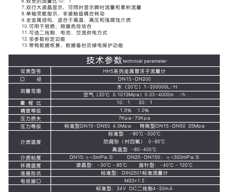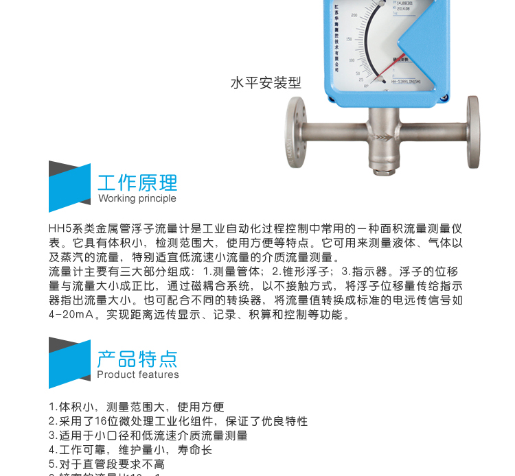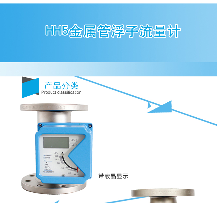 HH5系類金屬管浮子流量計(jì)是工業(yè)自動(dòng)化過程控制中常用的一種面積流量測(cè)量?jī)x表。它具有體積小,檢測(cè)范圍大,使用方便等特點(diǎn)。它可用來測(cè)量液體、氣體以及蒸汽的流量,特別適宜低流速小流量的介質(zhì)流量測(cè)量。 流量計(jì)主要有三大部分組成:1.測(cè)量管體;2.錐形浮子;