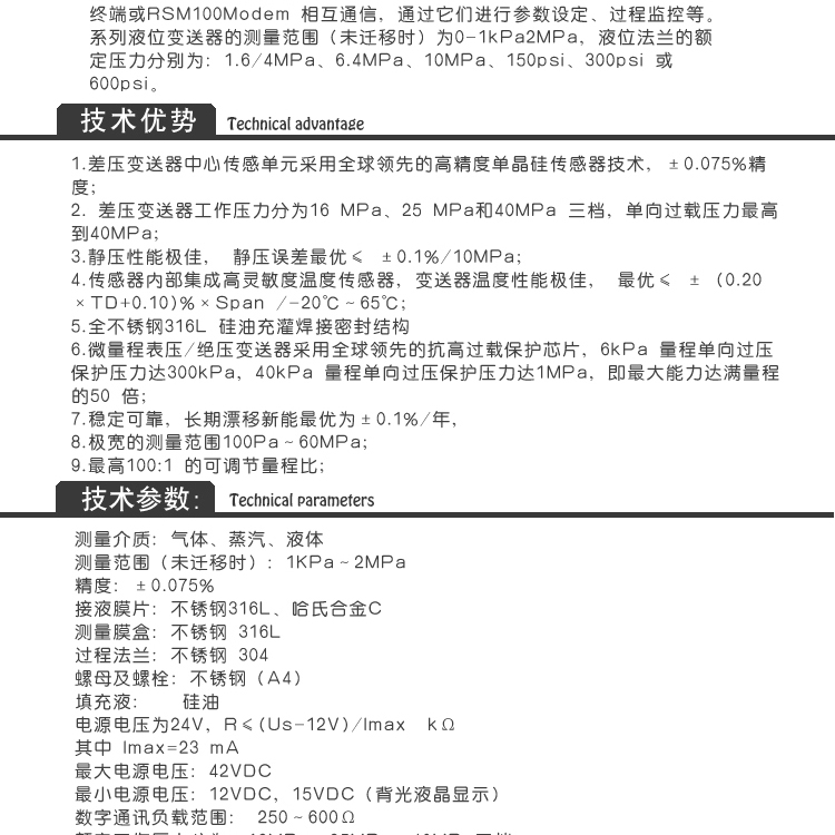 微量程表壓/絕壓變送器采用************的抗高過載保護(hù)芯片,6kPa 量程單向過壓保護(hù)壓力達(dá)300kPa,40kPa 量程單向過壓保護(hù)壓力達(dá)1MPa,即****能力達(dá)滿量程的50 倍,穩(wěn)定可靠,長(zhǎng)期漂移新能******為±0.1%/年,極寬的測(cè)量范圍100Pa~60MPa,最高100:1 的可調(diào)節(jié)量程比