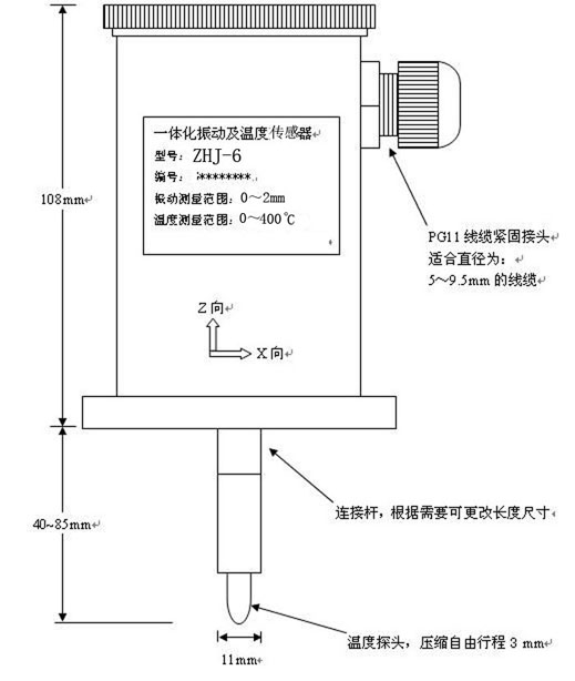 ZHJ-6型一體化振動(dòng)及溫度傳感器主要由X水平方向測(cè)振、Z垂直方向測(cè)振、軸承溫度測(cè)量三部分組成。內(nèi)部封裝了兩個(gè)振動(dòng)速度傳感器,其低頻響應(yīng)可以到5Hz,性能穩(wěn)定可靠,溫度測(cè)量采用Pt100鉑電阻做傳感元件,Pt100鉑電阻封裝在帶壓緊彈簧的探頭內(nèi),保證Pt100鉑電阻與軸承之間的溫度傳遞。